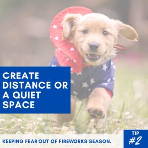 When you know a firework display is scheduled nearby, or you see your neighbors setting up for a display, consider asking a friend if you can bring your dog over for an evening chat or movie – unless your dog finds trips even more stressful. Where I live, it’s hit or miss. Some years are quiet & other years, not so much.