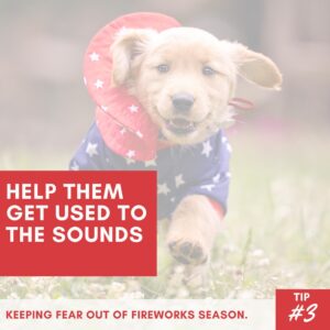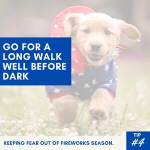 Did you know you can help desensitize your dog by playing a recording of fireworks? Start at a very low level for short periods, multiple times a day, and rewarding calm behavior with treats. If your dog is extremely fearful of noises, before taking this step, think about consulting an experienced dog behaviorist for expert guidance.