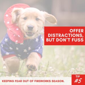 Instead, try gently distracting your dog. Turn those fireworks into background chatter by engaging in normal fun activities like playing with a toy, running through training exercises, or inviting your dog on the couch for a movie night. But don’t pull your dog out from a safe space they have chosen and force your dog to play if they would rather hide.