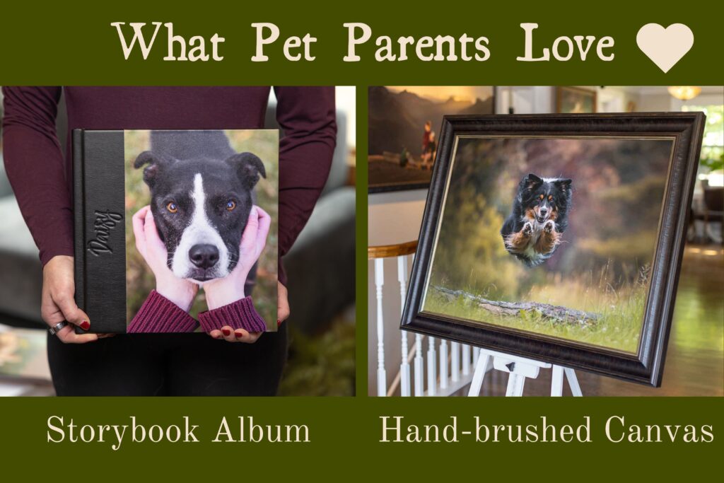 I couldn’t love these products more—and neither can the pet parents who have experienced a session with me. Most clients adore creating an album filled with cherished memories and pairing it with a stunning wall art piece that brings them daily joy. These keepsakes are more than just décor; they’re heartfelt reminders of the bond you share with your furry companion.