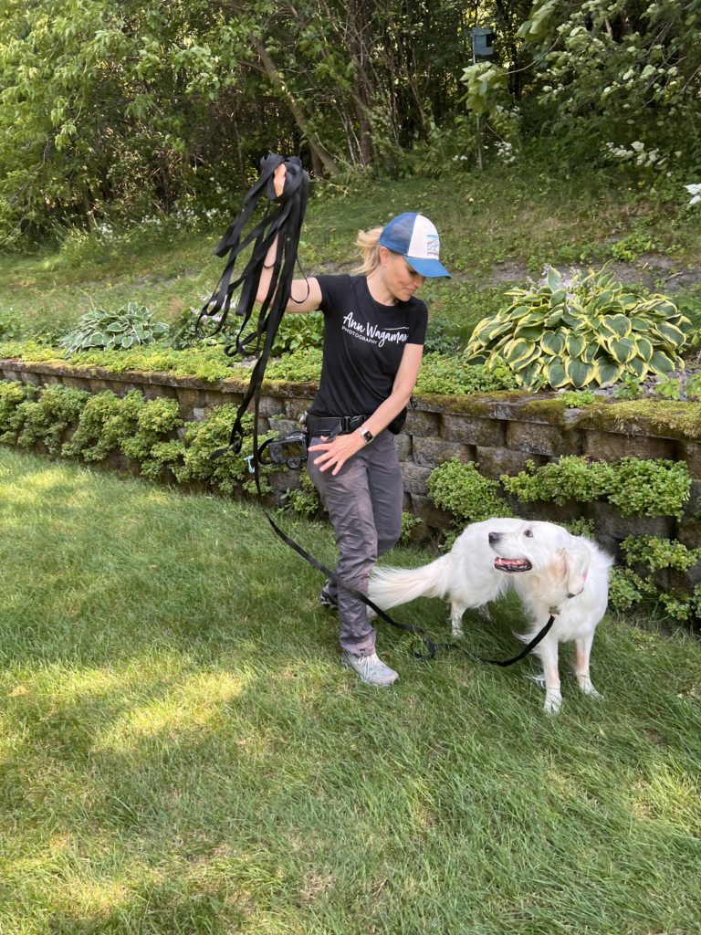 Millie’s enjoying a safe run while her human holds onto the super long leash.